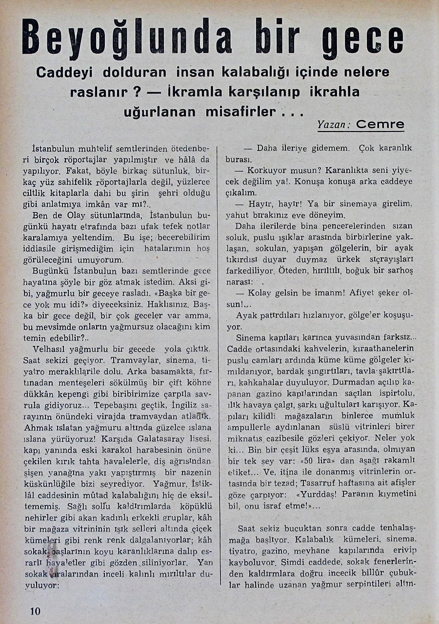 Bugünkü İstanbul’un bazı semtlerinde gece hayatına şöyle bir göz atmak istedim. Aksi gibi, yağmurlu bir geceye rastladı. “Başka bir gece yok mu idi?” diyeceksiniz. Haklısınız. Başka bir gece değil, bir çok geceler var amma, bu mevsimde onların yağmursuz olacağını kim temin edebilir?..